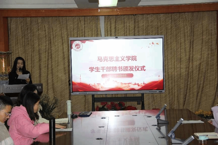 为进一步增强学生干部的身份认同感、归属感和荣誉感,促进学生干部快速成长,11月15日上午,必赢贵宾会3003官网在东配楼201会议室举办学生干部聘任仪式。会议由文体部干事李佳乐主持,必赢贵宾会3003官网党委书记武猛、党委副书记徐喆出席仪式,及全体马院学生干部参加仪式。