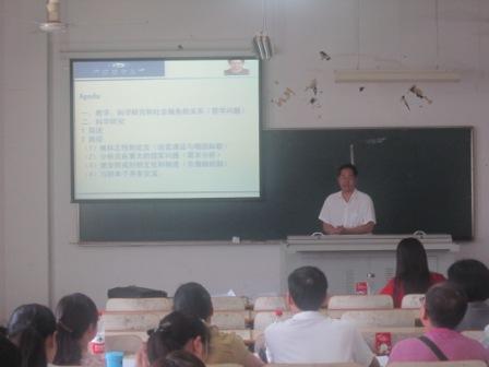 会议邀请了管理学院夏火松教授为全院教师作了题为教学与科学研究的探讨--哲学社会科学知识管理的视角的报告。夏教授从教学、科学研究和社会服务的关系为出发点,结合自身在科研申报方面的体会指出,高等教育中教学是本,科学是源,服务是桥,要融合好三者间的关系。正确处理好科研申报面临的困难和挑战,要多观察、勤思考、常沟通,根据自己的研究方向结合当前重大的现实问题找准选题、撰写申报材料。夏教授还从评委的角度讲诉了撰写材料时的一些注意事项。