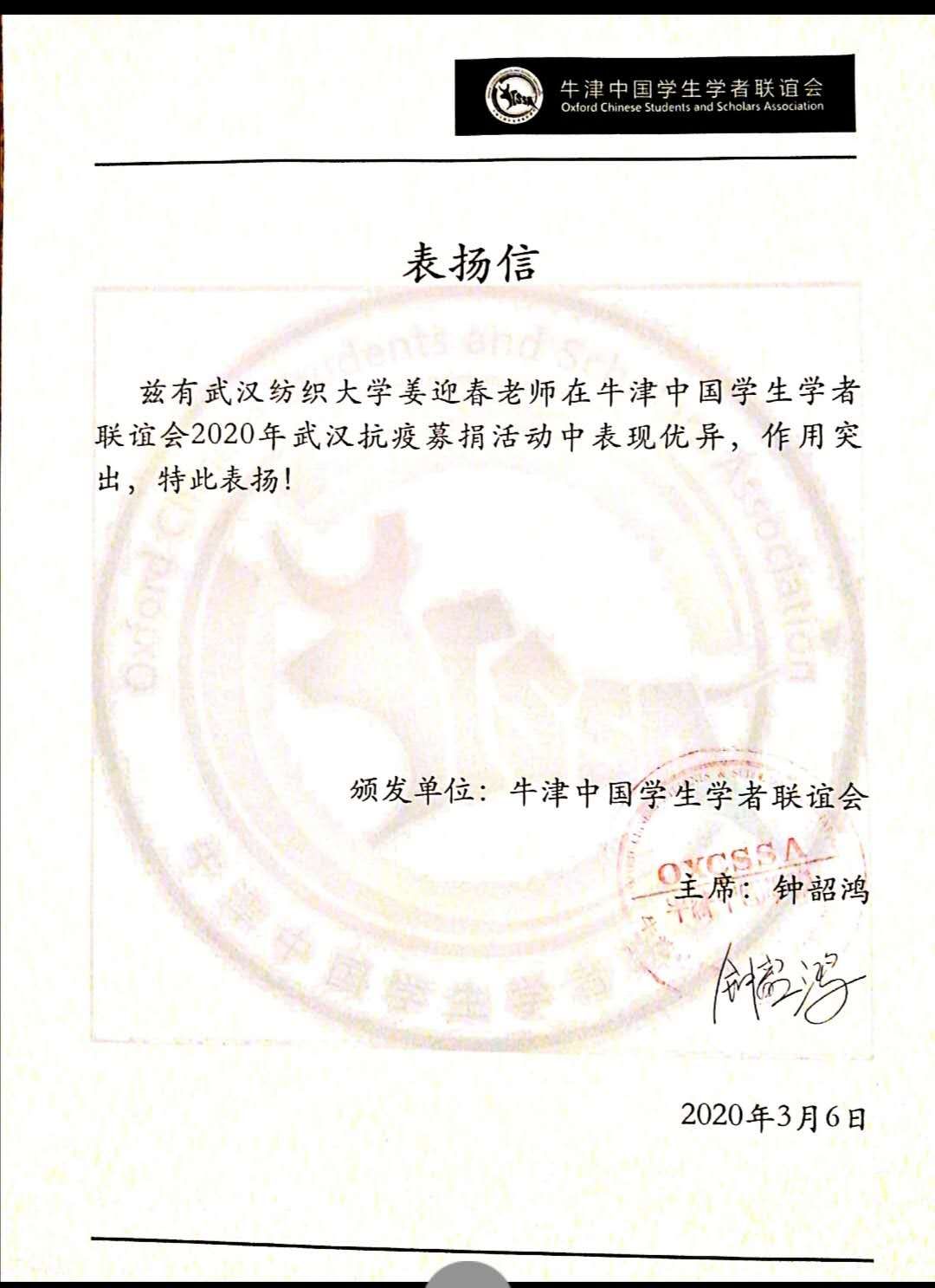 2020年1月湖北出现新冠肺炎疫情,医疗物质短缺。我院党员教师姜迎春正在英国牛津大学访学,听闻灾情,积极参与牛津大学中国学联组织的2020武汉抗疫募捐系列活动,联合必赢官网艺术学院的刘凡老师和必赢贵宾会3003官网的谷光曙老师,筹划募捐汇演,为演出设计舞台、宣传册等,发动小米英国公司捐助,使牛津学联一周内筹集了2万英镑,购买医疗物质支援武汉相关医院和灾情严重的黄冈地区,为此牛津中国学联在3月6日颁发表扬信,对该同志在募捐活动中的突出表现表示感谢!