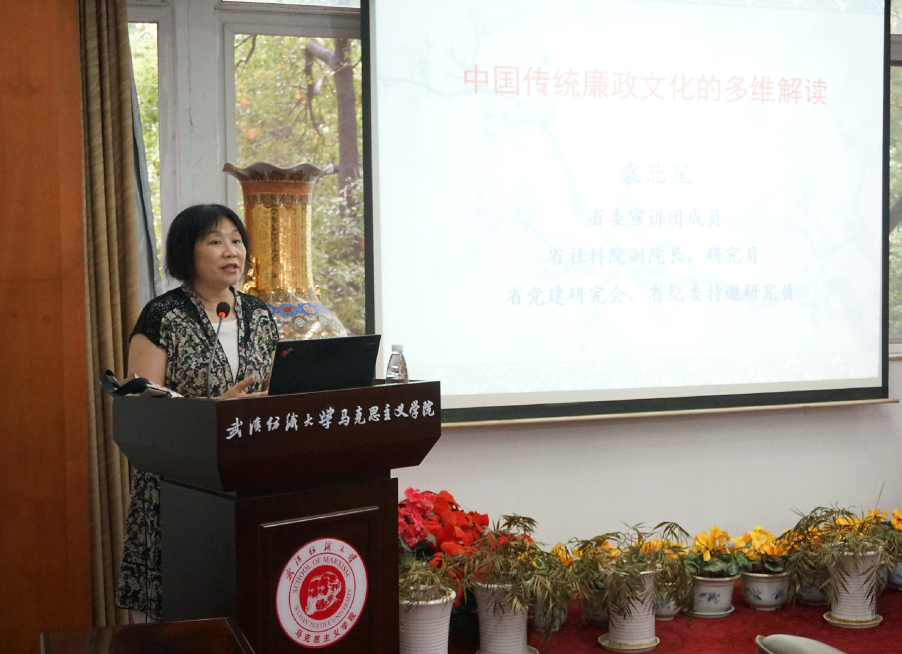 饮其流者怀其源,学其成时念吾师。为迎接湖北省党风廉政建设月及学校“我爱阳光”廉政文化书法大赛活动,9月10 日下午,湖北省社会科学院副院长袁北星研究员在201会议室为全院师生做了“中国传统廉政文化的多维解读”专题讲座。由学院院长金艳教授主持,全体师生参加了此次讲座。
