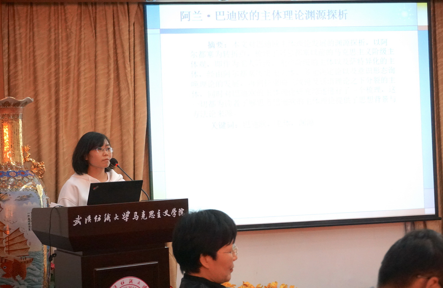 王欢博士以“阿兰·巴迪欧的主体理论渊源探析”为题,梳理了阿尔塞都之前的马克思主义阶级主体观,同时对巴迪欧的主体理论进行探究。何卓恩教授在肯定论文选题的重大意义,提出可以加强论述阿兰·巴迪欧的主体理论,以强化论文主体部分内容联系;并对文章四个部分的逻辑关系提出完善建议,引人深思。