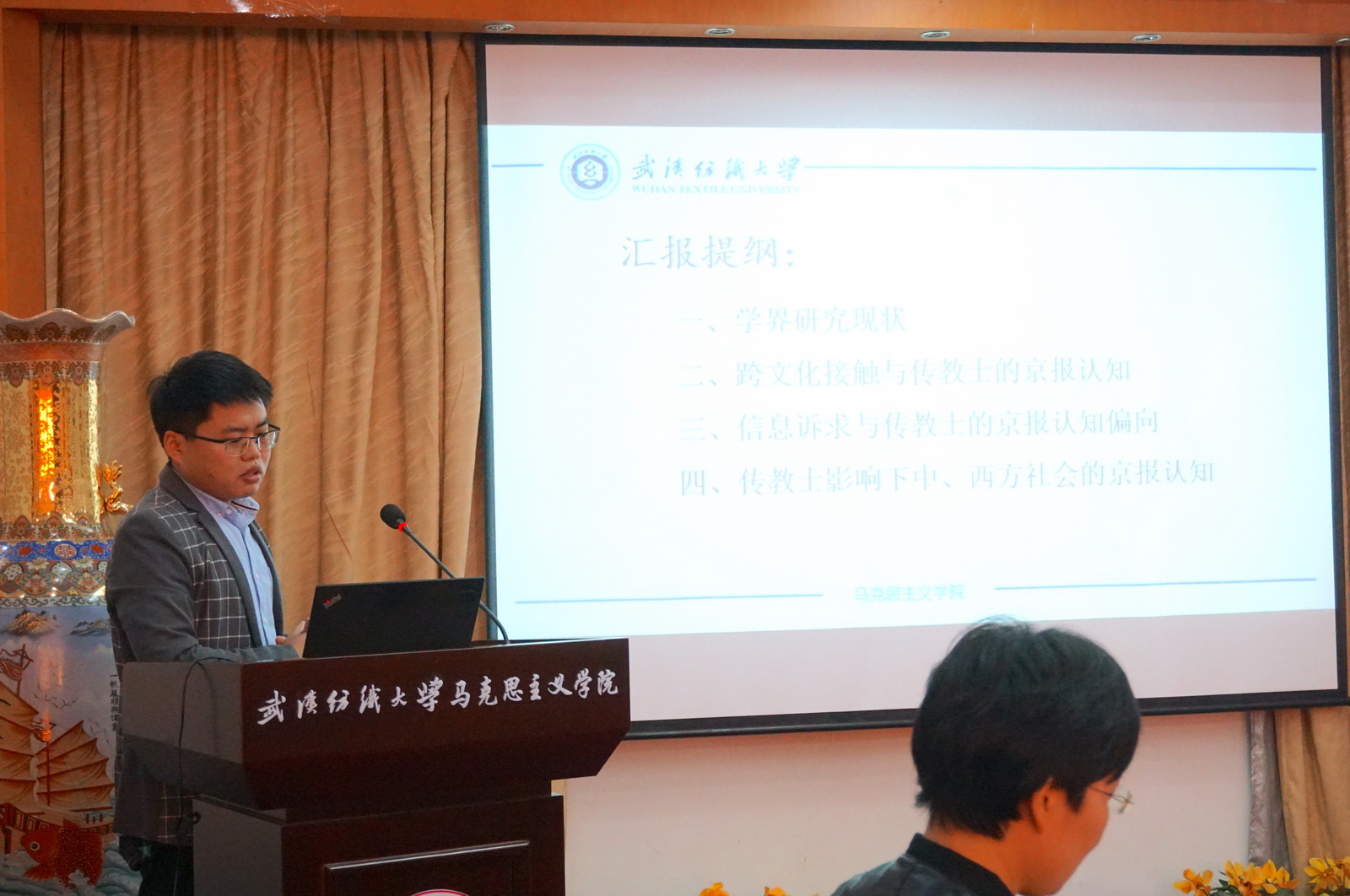 徐明涛博士作“跨文化体验下西方传教士对中国本土报刊的认知——以‘京报’为中心”主题报告,介绍当前学界的研究现状,以马礼逊为例介绍了跨文化接触与传教士对京报的认知以及历史上关于京报“索然无味”的观点,并分析京报对东西方社会的影响。何卓恩教授对论文选题的新颖视角、内容层次的清楚明了以及资料的丰富广泛表示赞赏,并建议对题目的具体落实要更加全面,对历史时间的把握要更加准确。