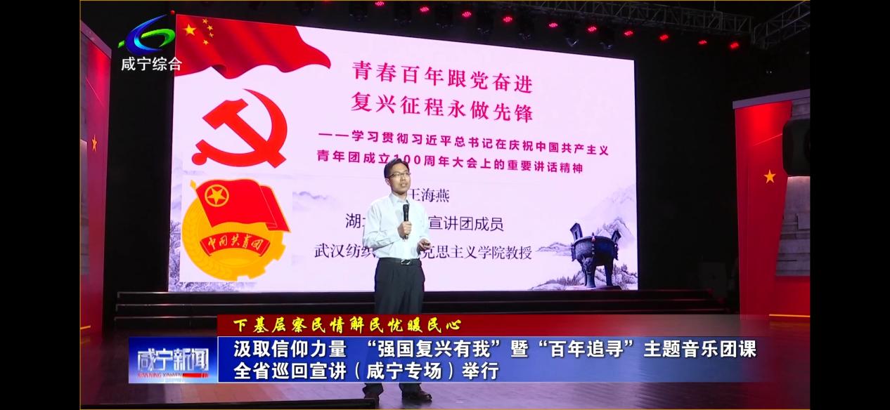 6月18日至24日,受共青团湖北省委邀请,我院王海燕教授作为湖北省青年宣讲团成员,先后赴咸宁、鄂州、黄冈等地,在赤壁市高质量发展研究院、咸宁方片互动网络有限公司、咸宁广播电视台、鄂州市葛店高级中学、蓝工水务公司、中船重工黄冈贵金属有限公司等单位,面向团干部、共青团员和广大青年职工,宣讲习近平总书记在庆祝中国共产主义青年团成立100周年大会上的重要讲话精神。