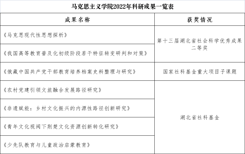 获第十三届湖北省社会科学优秀成果二等奖2项,获批国家社科基金重大项目子课题1项,湖北省社科基金项目4项。
