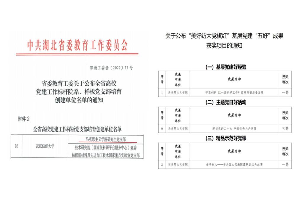研究生党支部入选全省高校党建工作样板党支部培育创建单位,学院党委获学校“美好纺大党旗红”基层党建好经验一等奖,精品示范好党课一等奖、主题党日好活动三等奖各1项。