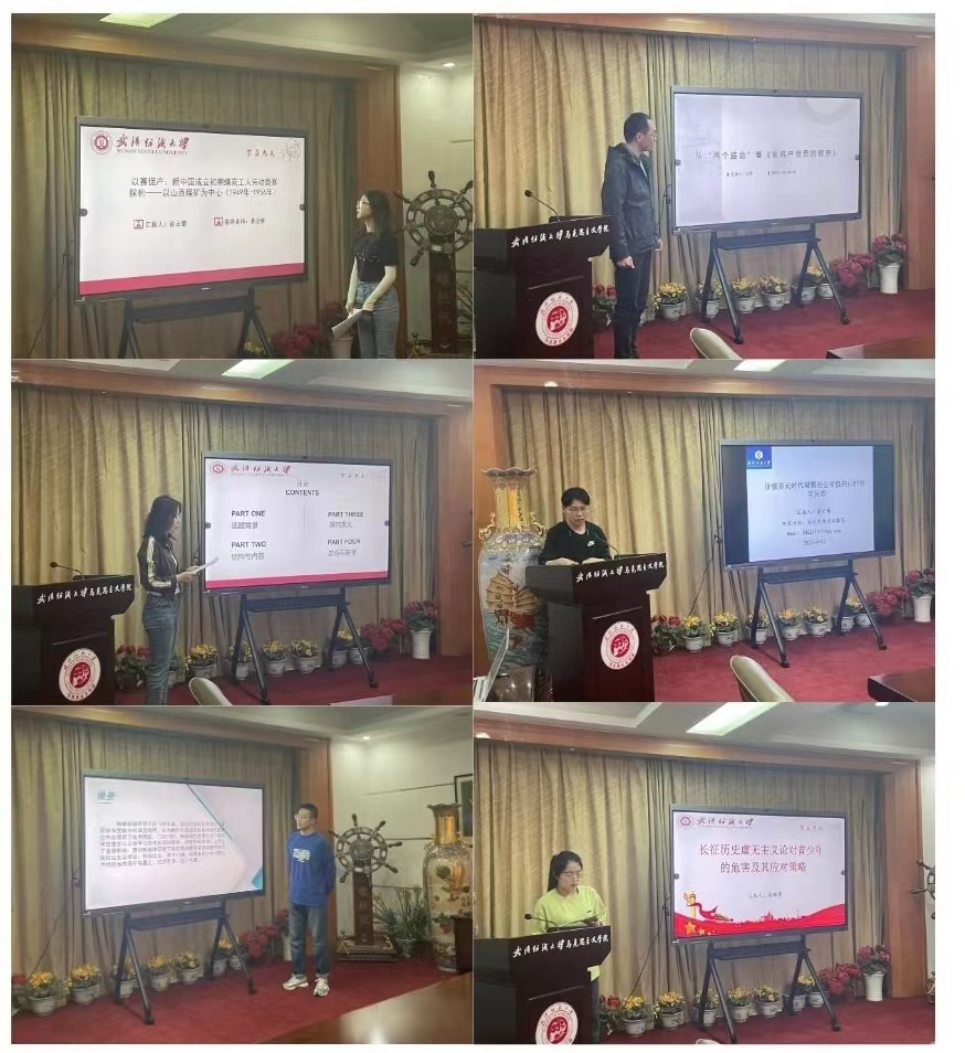 张博影以“新媒体视域下高校思政教育中的问题与对策研究”为主题进行汇报;刘璐华以“历史虚无主义对青少年的危害及应对策略”为主题进行汇报;彭旭以“双碳背景下绿色发展的重大意义”为主题进行汇报;栾云镪以“价值多元时代凝聚社会价值共识的哲学论析”为主题进行汇报;王野以“从‘两个结合’看‘论共产党员的修养’”为主题进行汇报;赵云蕾以“以赛促产:新中国成立初期煤炭工人劳动竞赛探析——以山西煤矿为中心”为主题进行汇报。