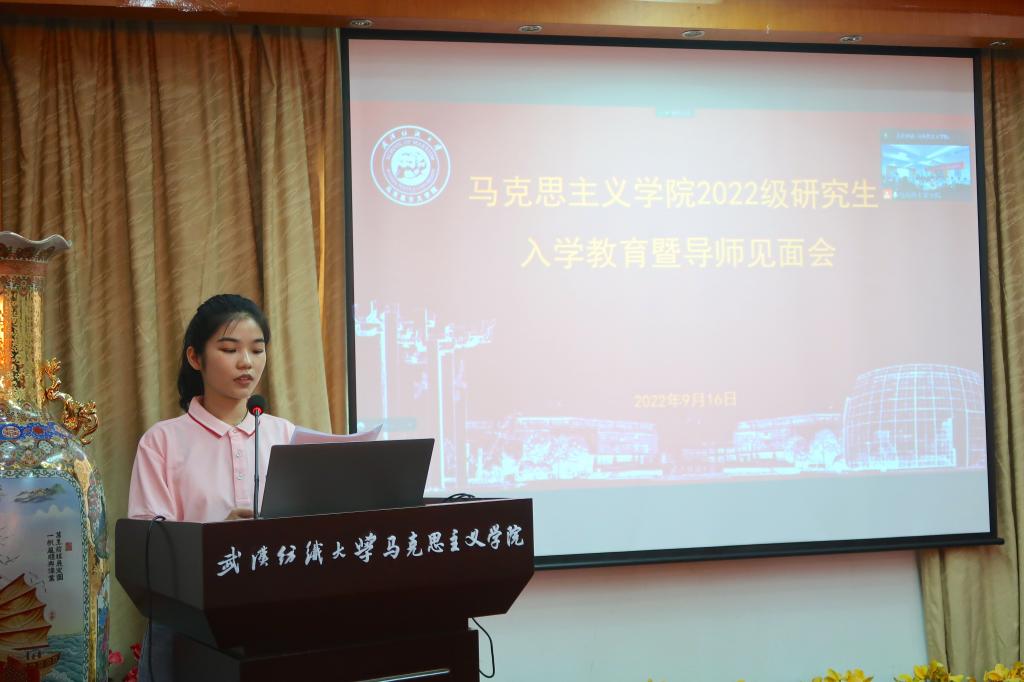 2022级研究生于燕鹏作新生代表发言。她分享了自己的求学之路。在谈到未来的学习规划时,她表示自己要努力成为一名“知行合一”的学子。并且号召2022级马院学子明确目标、做好规划、克服浮躁、善于创新、学以致用,为中华民族的伟大复兴贡献力量。