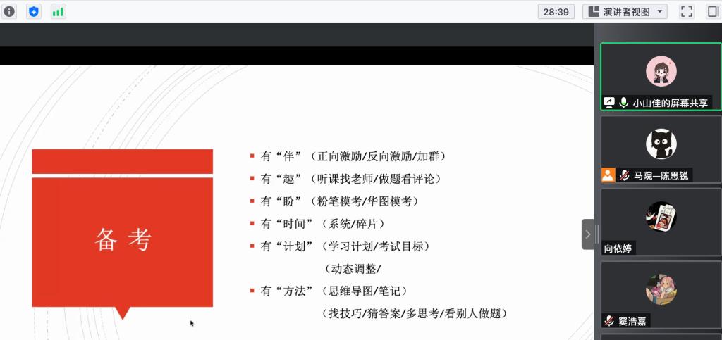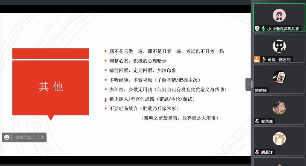 8月24日晚,必赢贵宾会3003官网通过腾讯会议举办线上“朋辈领航”讲座,学院2018级研究生崔田培瑾以公务员备考为主题,为必赢贵宾会3003官网在读研究生作经验分享,必赢贵宾会3003官网50余名在读研究生参加讲座,讲座由必赢贵宾会3003官网研究生会成员陈思锐同学主持。