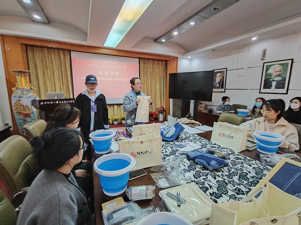 为进一步铸牢大学生中华民族共同体意识,弘扬优秀传统文化坚定树立文化自信,3月1日下午,马院邀请服装学院副教授、研究生导师王妮为“初心”实践团成员开展手工蓝染体验课。