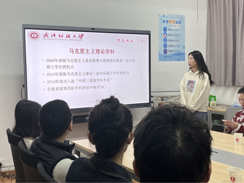 会前,马院研究生会学术部部员司青青带领服装学院研究生会成员参观了我院的图书室以及课程教室。随后,双方部门成员进行自我介绍,我院研究生会主席冯艳平对服装学院研会的到来表示了热烈欢迎。